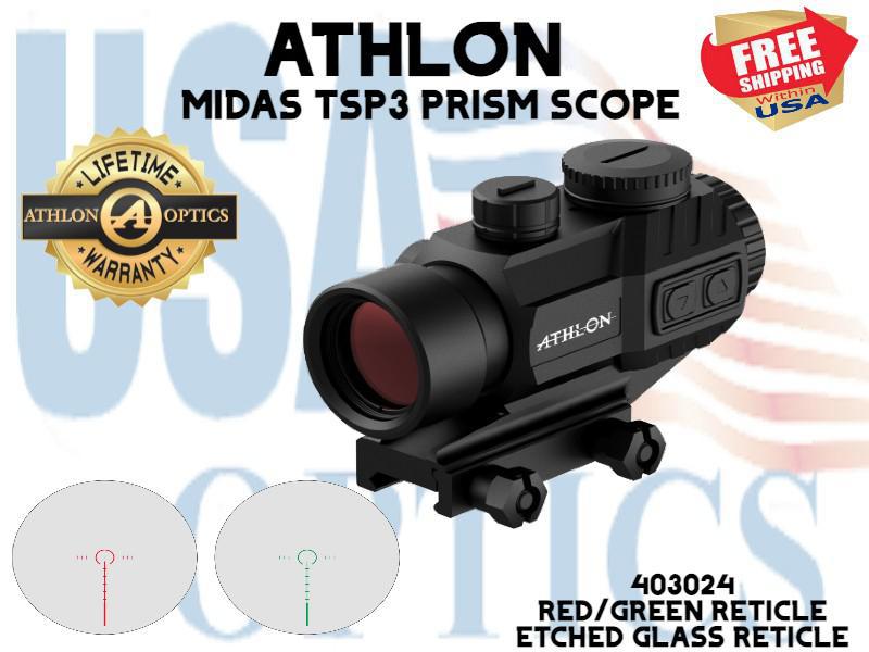 When you want quick target acquisition at both short and medium ranges you need additional magnification. The Athlon prism red dot scopes give you great versatility. This device is equipped with a prism for a crisp, vivid image. The prism-based design allows for a more compact scope without sacrificing optical quality. With this longer focal length it can achieve the magnification needed to reach out and touch targets at longer ranges. The Athlon prism red dots are nitrogen-filled, fog proof and shock proof, allowing for reliable use in a wide range of environments. Featuring a selectable red/green illuminated reticle with multiple intensity levels to match your specific conditions. The reticles are etched directly on the glass to make sure you have consistent point-of-aim at all times. Whether you have the illumination on or off, the reticle is always visible. Midas TSP3 Model has an TSP3 reticle in it.