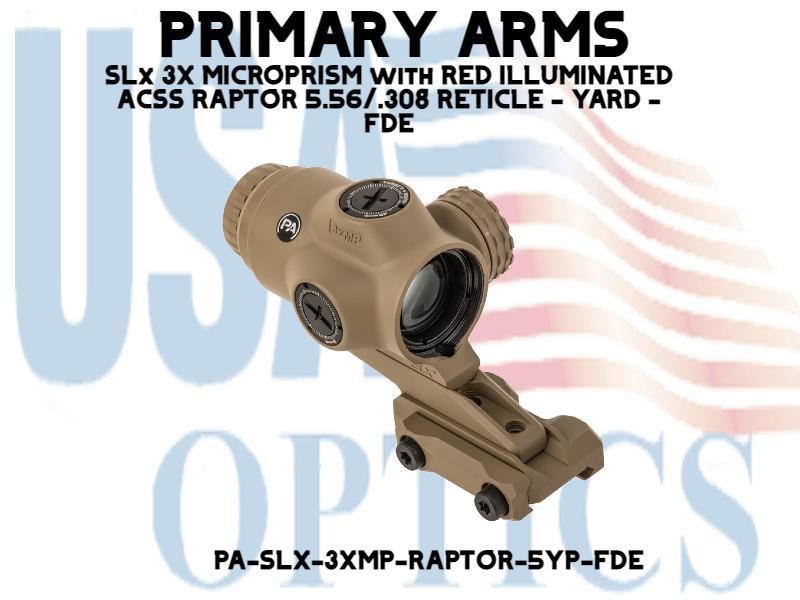 Primary Arms, PA-SLX-3XMP-RAPTOR-5YP-FDE, SLx 3X MICROPRISM with RED ILLUMINATED ACSS RAPTOR 5.56/.308 RETICLE - YARD - FDE
